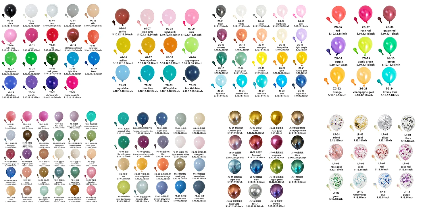 300 से अधिक लोकप्रिय रंग हमेशा स्टॉक में रहते हैं: मैट रंग गुब्बारा (शुद्ध लाल, शाही नीला, नींबू पीला, चमकीला गुलाबी, शुद्ध सफेद, काला), मैकरॉन रंग गुब्बारा (पुदीना हरा, क्रीम पीला, हल्का गुलाबी, हल्का नीला), धातु रंग गुब्बारा (सोना, चांदी, गुलाब सोना), मोती रंग, फ्लोरोसेंट रंग, आदि।