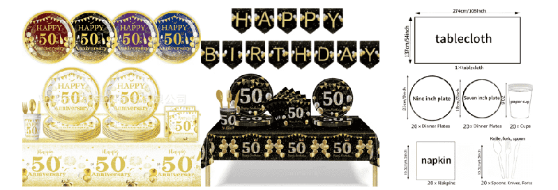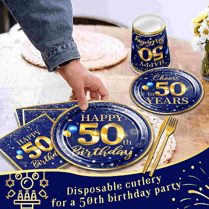 पेपर बर्थडे टॉपर: केक सजावट के मुख्य आइटम के रूप में, मुख्य कार्ड "50 साल की उम्र तक जन्मदिन मुबारक हो" शब्दों को मूल के रूप में लेता है, और आतिशबाजी, सितारों, जन्मदिन की टोपी और अन्य आकृतियों के साथ मुख्य केक सजावट से मेल खाता है। सपोर्टिंग राउंड "50", शुभ बादल, मुकुट और अन्य मिनी कार्ड, जो मोटे कार्डबोर्ड से बने होते हैं और ठोस बांस की छड़ियों से मेल खाते हैं, उत्तम विवरण के साथ कपकेक और मिठाई की मेज से सजाए जा सकते हैं।