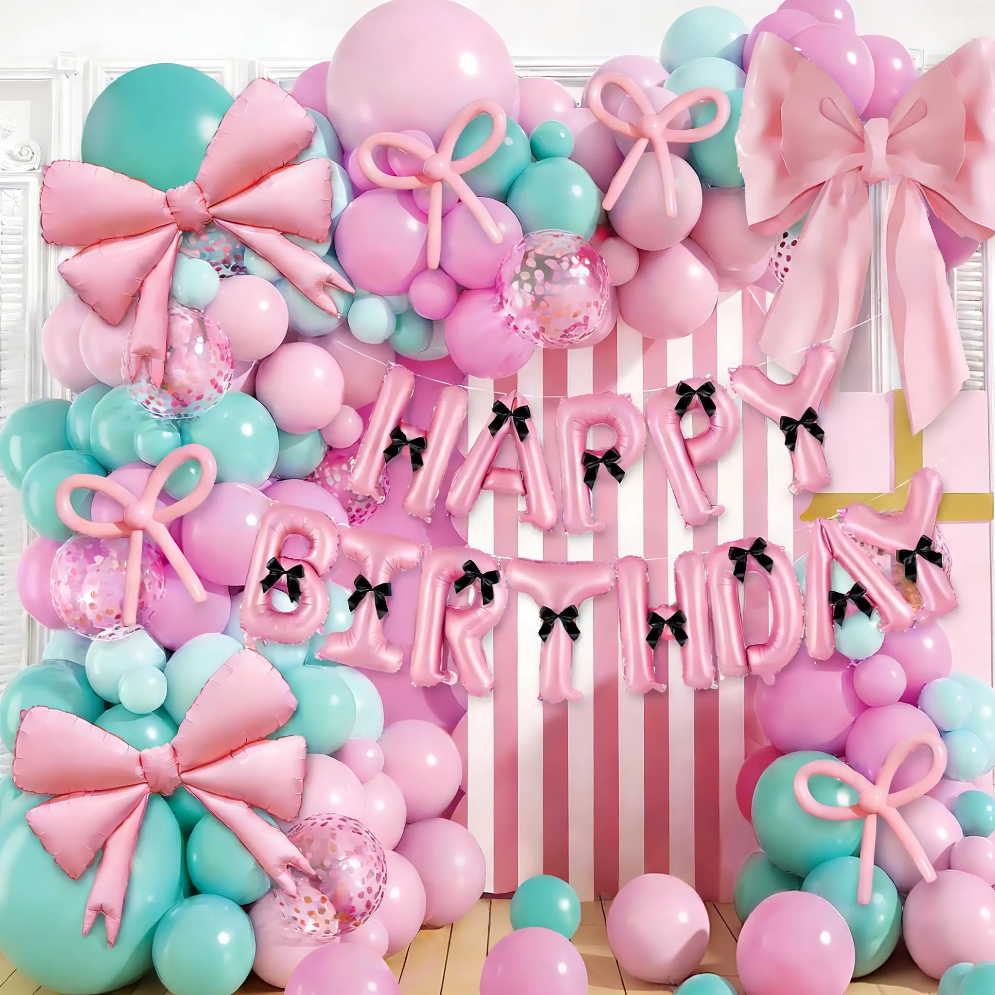इस सेट में मैकरून पिंक, मैकरून टिफ़नी ब्लू, मैकरून रोज़ रेड, मैट स्किन पिंक और मैट टिफ़नी ब्लू रंग शामिल हैं। इसमें 5 इंच, 10 इंच, 12 इंच और 18 इंच का गुब्बारा है। गोंद बिंदु और गुब्बारा पट्टी आपके अंतिम ग्राहकों को इस सेट को आसानी से इकट्ठा करने में मदद कर सकती है। फ़ॉइल बो गुब्बारा, काला रिबन और 260 लंबा गुब्बारा इस सेट के मुख्य भाग हैं।