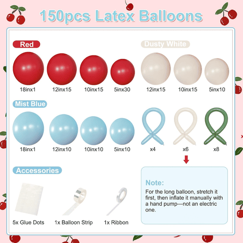 चेरी ब्लॉसम बैलून आर्क का लेटेक्स बैलून 100% कच्चे लेटेक्स से बना है जिसे दक्षिण पूर्व एशिया से आयात किया जाता है। सामग्री पर्यावरण के अनुकूल है और बच्चों और वयस्कों के लिए पूरी तरह से हानिरहित है। इनका साइज 5 इंच से लेकर 18 इंच तक है। लाल 5 इंच के लेटेक्स गुब्बारे और हरे लंबे लेटेक्स गुब्बारे का उपयोग सुंदर छोटी चेरी शैली बनाने के लिए किया जाता है।