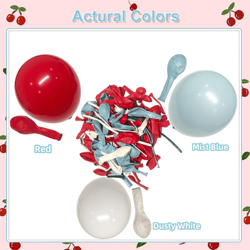 चेरी ब्लॉसम बैलून आर्च विभिन्न लेटेक्स बैलून के साथ आता है, जिसमें गोल लेटेक्स बैलून और लंबा लेटेक्स बैलून शामिल हैं। किट की कुल शैली सकारात्मक और सुंदर है, इसे दुनिया भर के ग्राहकों द्वारा पसंद किया गया। गोल लेटेक्स गुब्बारे का रंग लाल, धूल भरा सफेद और धुंध नीला है। और लंबे लेटेक्स गुब्बारे धुंधले नीले, धूल भरे सफेद और हरे रंग के होते हैं, लंबे लेटेक्स गुब्बारे का उपयोग बो टाई शैली और चेरी शैली बनाने के लिए किया जाता है।