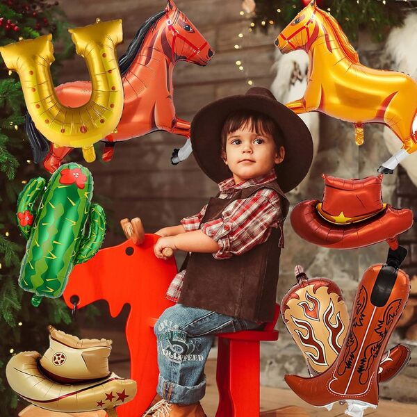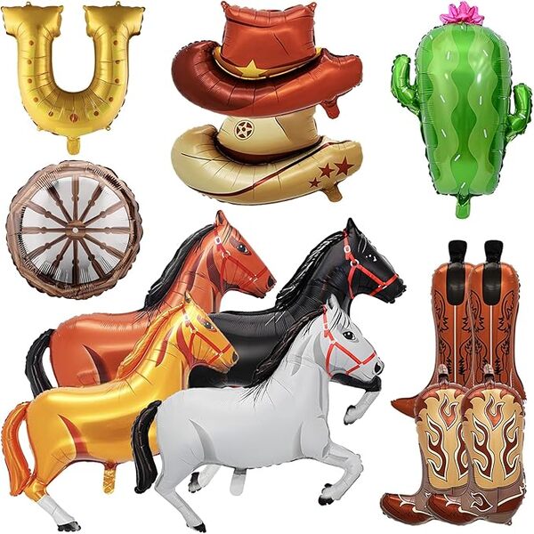 काउबॉय फ़ॉइल गुब्बारे माला सेट:इस गुब्बारा माला सेट की मुख्य विशेषता हवा में उड़ते हुए घोड़े की पन्नी के गुब्बारे हैं। इस प्रभाव को बनाने के लिए आप उन्हें डॉट ग्लू और रिबन से ठीक कर सकते हैं। इसके अलावा, काउबॉय हैट फ़ॉइल गुब्बारे और काउबॉय बूट फ़ॉइल गुब्बारे एक अच्छा संयोजन होगा। सेट का मुख्य भाग पश्चिमी शैली के डिज़ाइन वाले लेटेक्स गुब्बारों से बना है। विभिन्न आकारों के लगभग 60-80 टुकड़े गुब्बारे हैं, जिनमें भूरे, काले और काले और सफेद गाय के रंग आदि शामिल हैं।