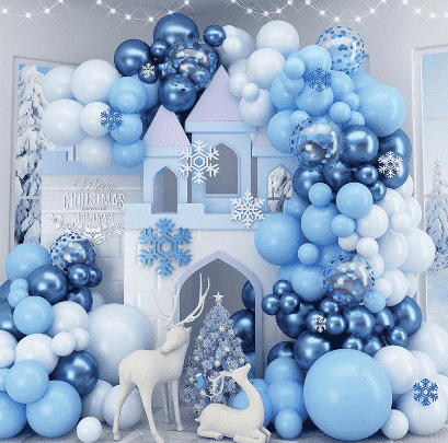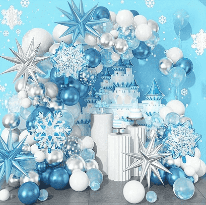3.जमे हुए गुब्बारा माला किटआमतौर पर इसमें विभिन्न आकार होते हैंजमे हुए गुब्बारे, अद्वितीय फ़ॉइल गुब्बारे, मैचिंग सजावटी रिबन, इन्फ्लेटर, अचिह्नित गोंद स्पॉट, इंस्टॉलेशन टाई और अन्य सहायक उपकरण एक ही स्थान पर लेआउट आवश्यकताओं को पूरा करने के लिए। सभी घटक सुरक्षित और पर्यावरण के अनुकूल सामग्रियों से बने हैं, जो पूरी तरह से बच्चों की गतिविधि के दृश्यों के लिए अनुकूलित हैं। सूट में गुब्बारा पैटर्न सावधानी से मिलान किया गया है, जो स्वप्निल बर्फ और बर्फ के तत्वों के साथ फ्रोजन की क्लासिक चरित्र छवि को जोड़ता है। रंग नीले, सफेद और चांदी हैं, जो एक शुद्ध और रोमांटिक जादुई माहौल बनाते हैं।