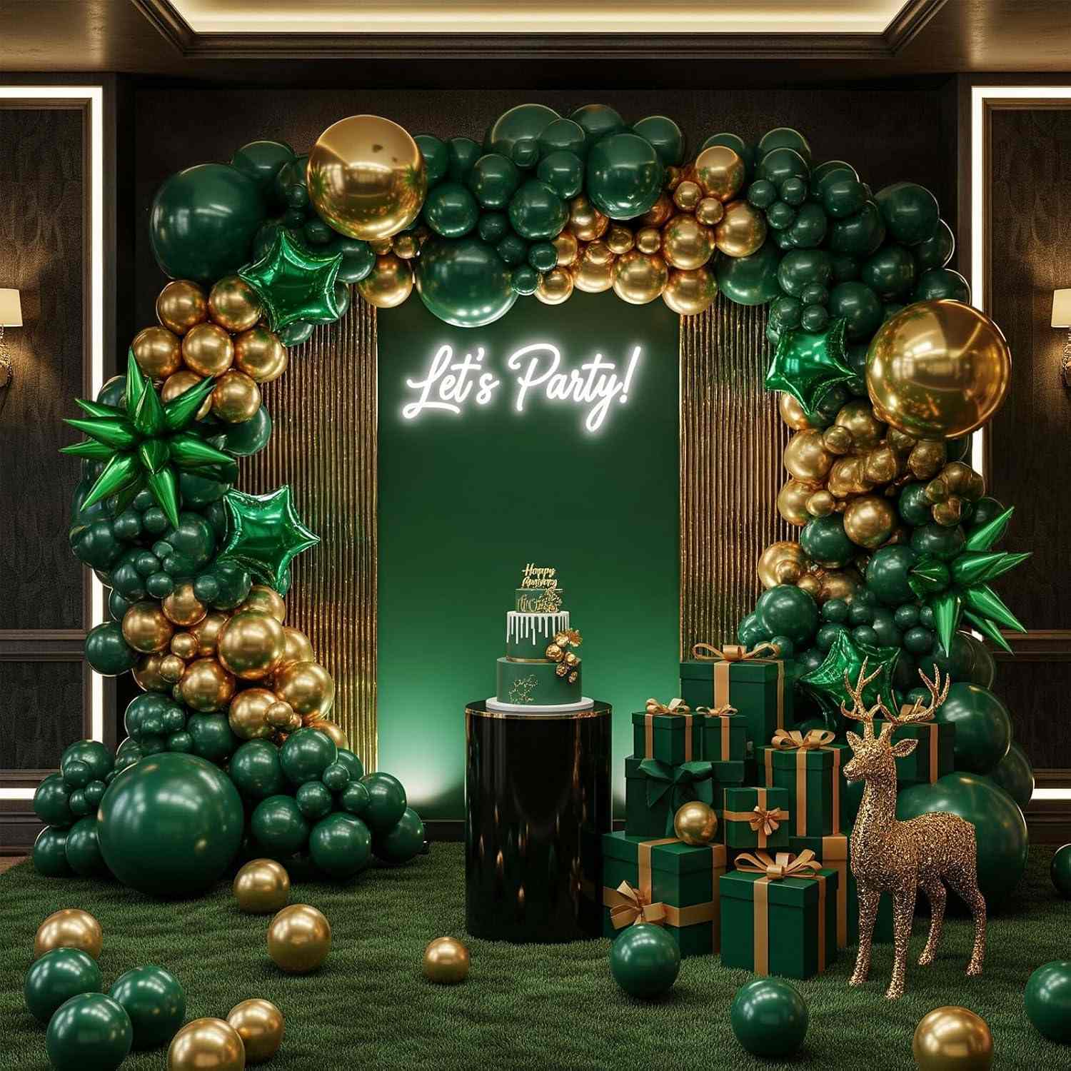 हरा और सुनहरा पार्टी बैलून आर्क किसी भी दृश्य का मुख्य दृश्य हो सकता है। यह बनावट और समारोह की एक मजबूत भावना जोड़ता है। यह अनुग्रह और विशेष स्वाद दोनों को दर्शाता है।