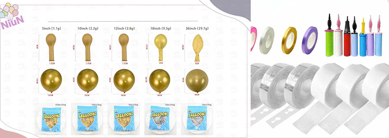 आर्क सेट में 5-इंच, 10-इंच, 12-इंच, 18-इंच या 36-इंच के गुब्बारे हैं। इन विभिन्न आकारों के संयोजन से आप आसानी से पूर्ण और स्तरित लुक वाला गुब्बारा आर्क बना सकते हैं।