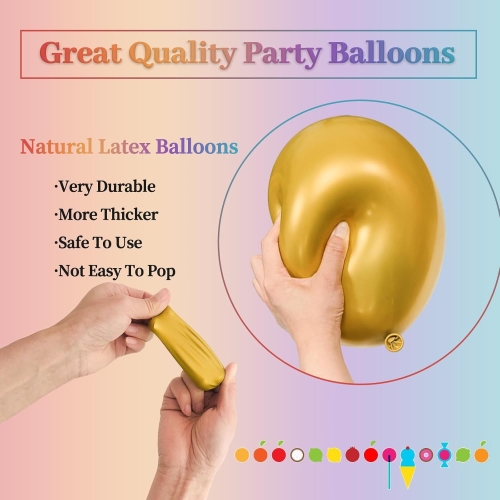उच्च गुणवत्ता वाले धातु रंग के गुब्बारे के छोटे सेट गाढ़े, उच्च-लोचदार लेटेक्स का उपयोग करते हैं। उनकी दर्पण जैसी चमकदार सतह होती है। प्रकाश उनसे परावर्तित होता है। यह एक समृद्ध, चमकदार धात्विक प्रभाव पैदा करता है। नियमित लेटेक्स गुब्बारे सपाट और मैट दिखते हैं। ये गुब्बारे उच्च गुणवत्ता वाले लगते हैं। वे तुरंत नज़र भी खींच लेते हैं.