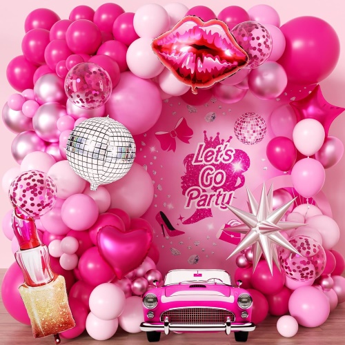 सेट में 5 इंच और 12 इंच मैट गुलाबी लेटेक्स गुब्बारे, 5 इंच और 12 इंच मोती गुलाबी लेटेक्स गुब्बारे, 5 इंच और 12 इंच धातु गुलाबी लेटेक्स गुब्बारे, 5 इंच और 12 इंच सफेद लेटेक्स गुब्बारे, 12 इंच गुलाबी कंफ़ेटी लेटेक्स गुब्बारे, 18 इंच गुलाबी और सफेद हार्ट फ़ॉइल गुब्बारे, 18 इंच स्टार फ़ॉइल गुब्बारे, गुलाबी फ़ॉइल पर्दा, गुलाबी हैप्पी बर्थडे फ़ॉइल गुब्बारे, तितलियों की सजावट और सहायक उपकरण शामिल हैं। गोंद बिंदु, गुब्बारे पट्टी और रिबन के रूप में।