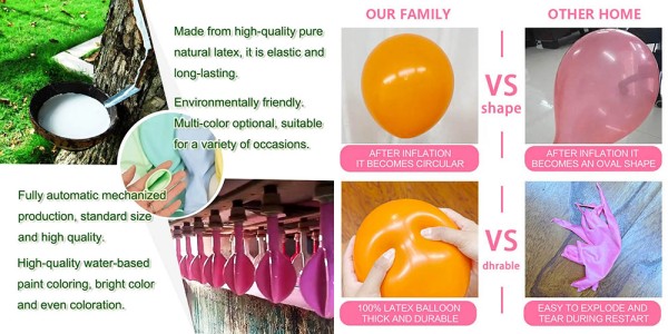 मजबूत बनावट: उच्च गुणवत्ता वाले कच्चे माल और उन्नत तकनीक के उपयोग के कारण, हमारे प्रत्येक लेटेक्स गुब्बारे में बहुत मजबूत बनावट और समृद्ध रंग होते हैं।