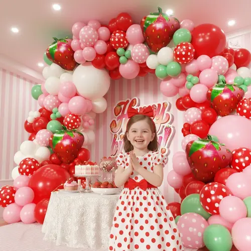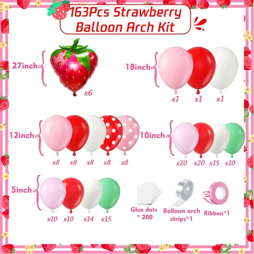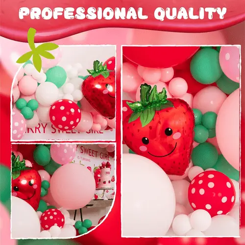 स्ट्रॉबेरी थीम वाली गुब्बारा माला उच्च गुणवत्ता वाले लेटेक्स गुब्बारे और फ़ॉइल गुब्बारे से बनी है। किट में सबसे प्रमुख वस्तु 27 इंच का स्ट्रॉबेरी फ़ॉइल गुब्बारा है। इसके अलावा, इसमें मौजूद लेटेक्स गुब्बारे भी एक महत्वपूर्ण हिस्सा हैं। किट में मौजूद लेटेक्स गुब्बारे अलग-अलग रंगों और आकारों के होते हैं, जो खूबसूरत परतें बना सकते हैं। लेटेक्स बैलून का रंग मैकरॉन गुलाबी, मैट लाल, मैट गहरा गुलाबी, रेट्रो आइवरी सफेद है।