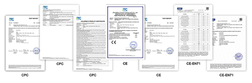 हमारे उत्पादों की पूरी श्रृंखला ने यूरोपीय और अमेरिकी और अन्य लक्षित बाजार सुरक्षा नियमों के सख्त अनुपालन में सीपीसी, सीई, ईएन71 और अन्य आधिकारिक प्रमाणीकरण पारित कर दिया है। ये योग्यताएं आपके सामान को सीमा शुल्क को सुचारू रूप से पूरा करने और विदेशी बाजारों में अनुपालन जोखिमों से पूरी तरह बचने में मदद कर सकती हैं।